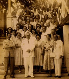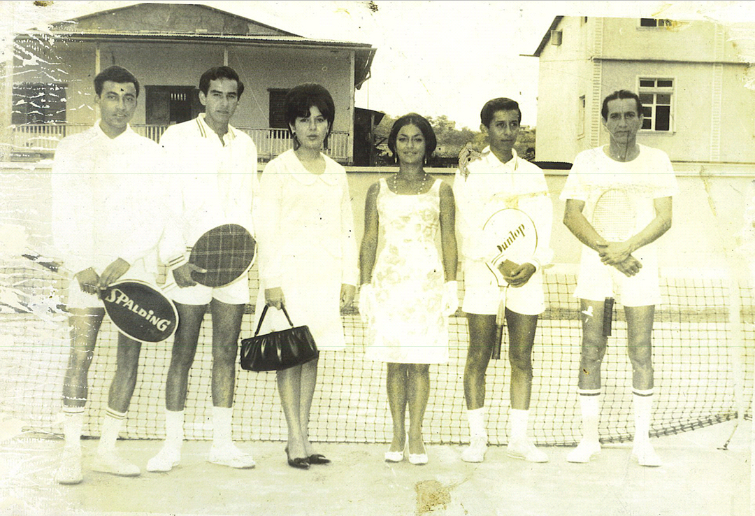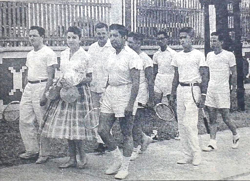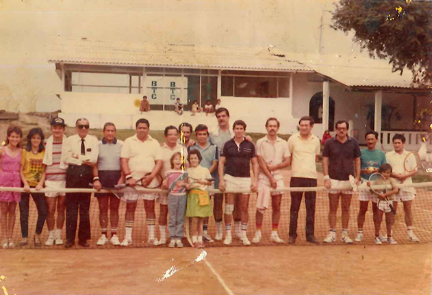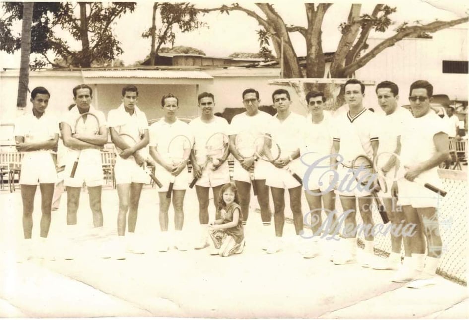 Encuentro deportivo entre el BTC y el Portoviejo Tenis Club. De izquierda a derecha: José Polit, Atilano García, Macario Uscocovich (de Bahía) N.N. , N.N. , N., Horacio Hidrovo (Portoviejo), Gustavo Uscocovich ( Bahía), Felipe Caicedo, N.N. (Portoviejo), Dr. Francisco Berrezueta (Bahía). En Portoviejo.