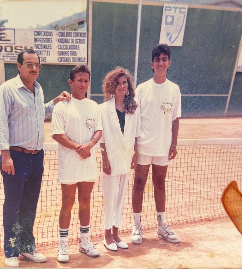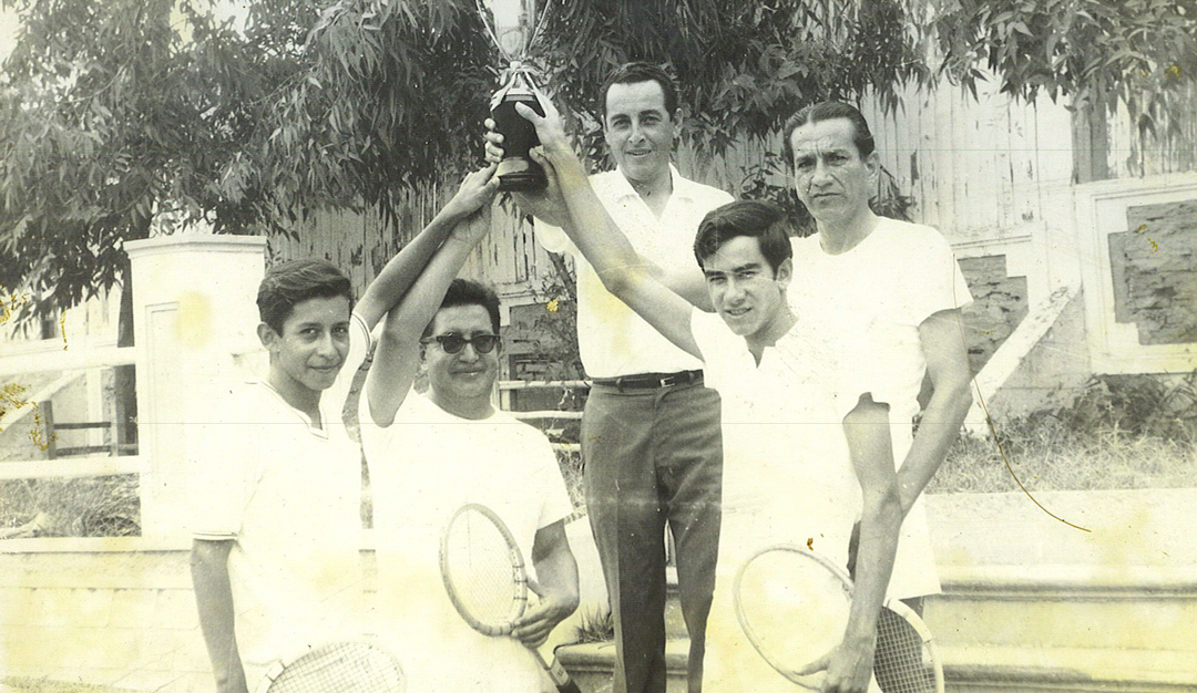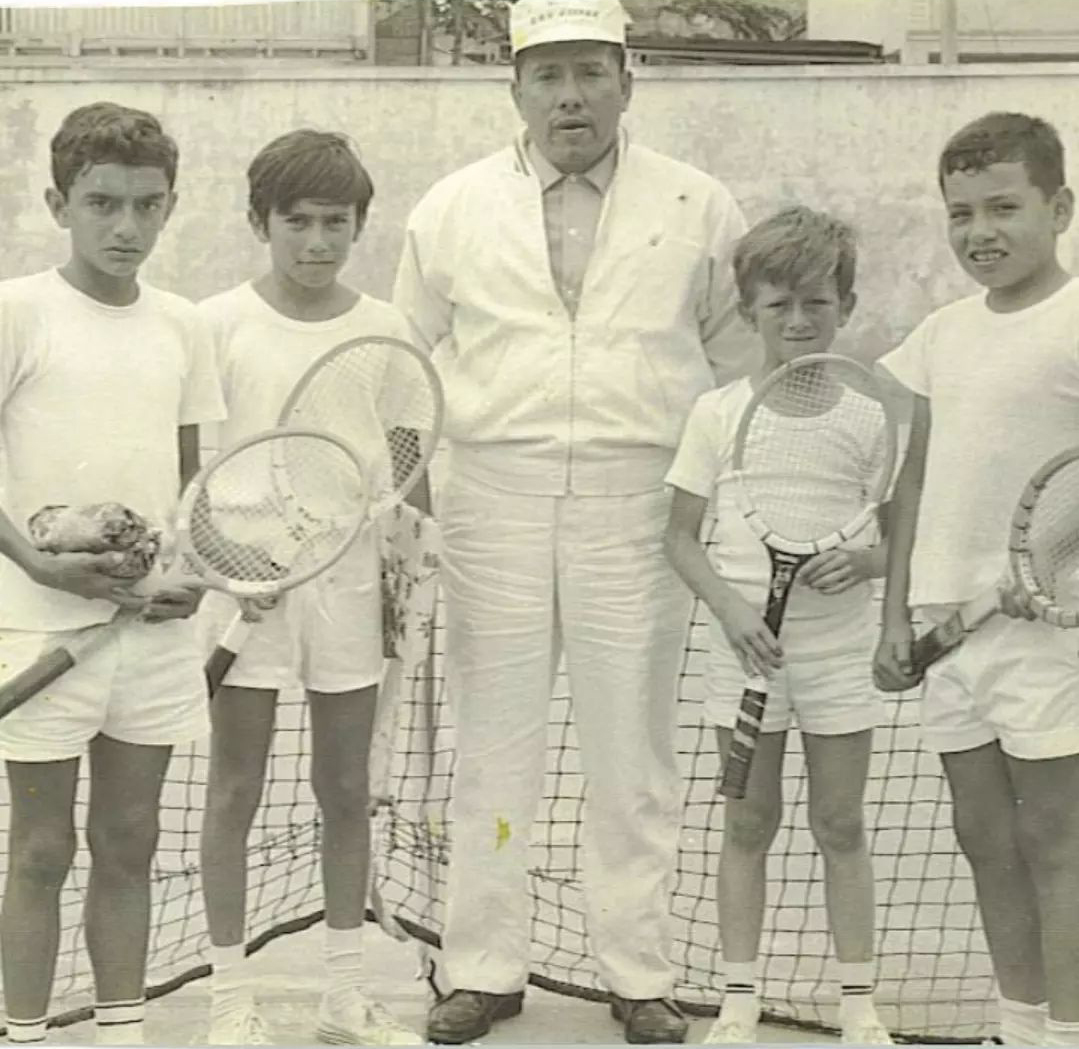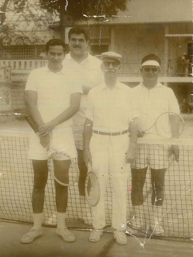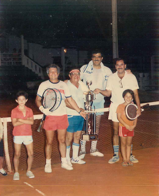 Dr. Carlos Cevallos junto a sus hijos y el tenista Andrés Gómez, en el Bahía Tenis Club.