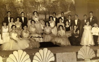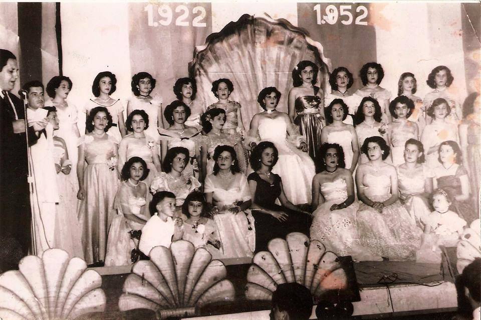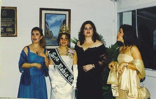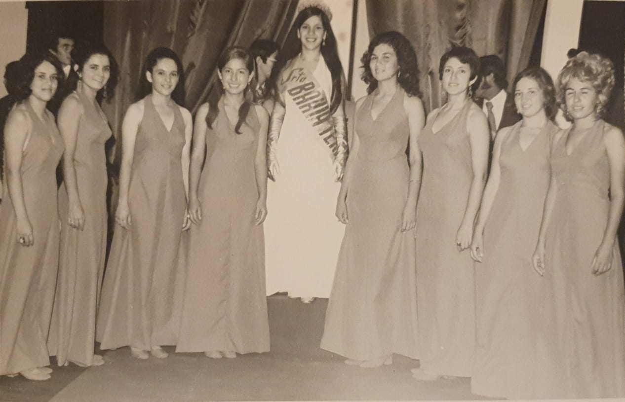 Gladys Balda, Reina por los 50 años del Bahia Tenis Club (1972) junto a su corte de honor. De izquierda a derecha: Beatriz Intriago, Graciela Intriago, Ursula Balda, María Elena Chang. Al centro la Reina, Campola García, Leonor Álava, Carmen Moreno, María del Carmen Paz.