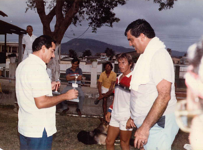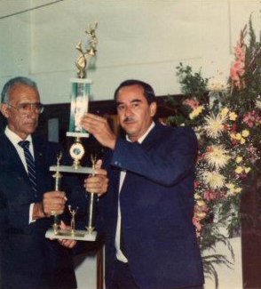 Gustavo Vélez, vicepresidente del club, entrega la copa a Coco Zavala, campeón sub 14 y sub 16 del BTC. Años 90.